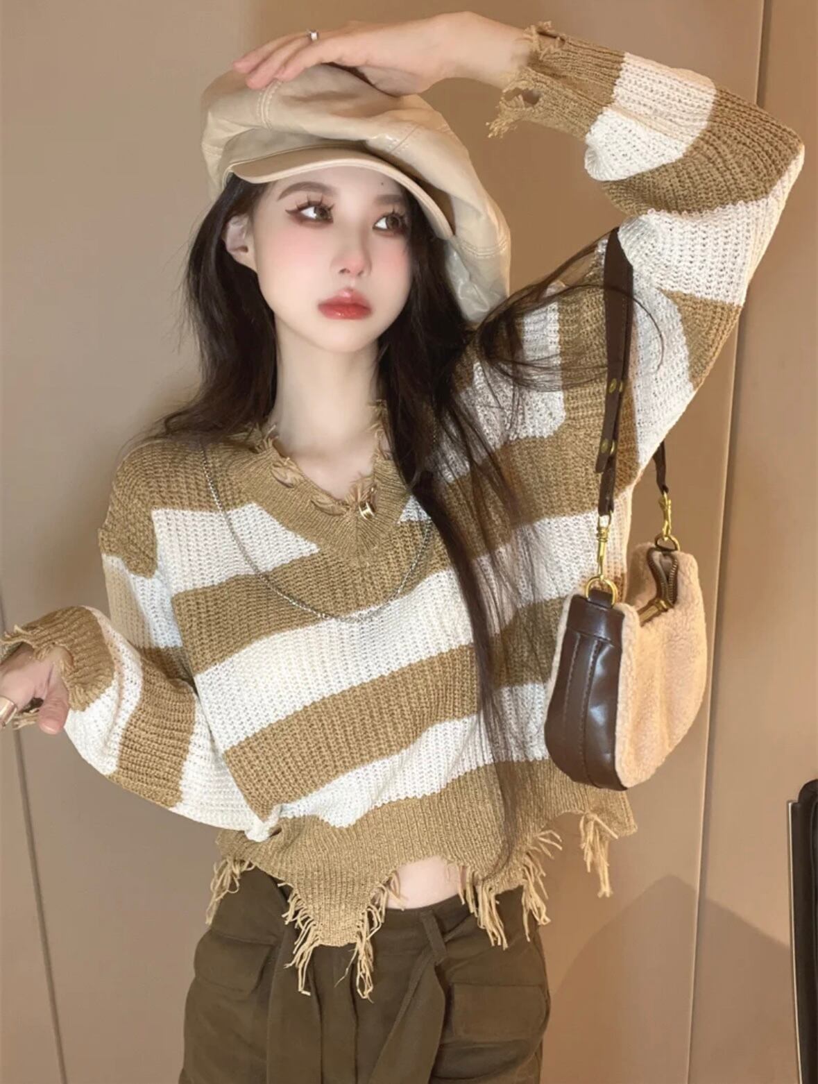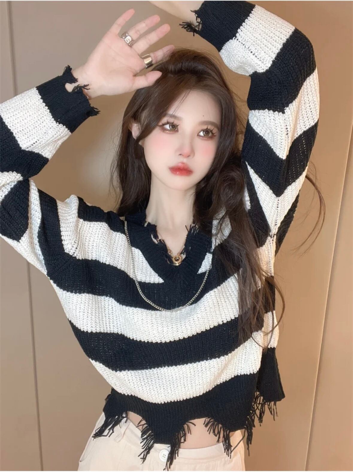 このthick stripes fringe knit Topは、太めのストライプ柄とフリンジディテールがおしゃれポイント。首元から裾にかけてのフリンジが、ユニークなアクセントになっています。トレンド感満載のアイテムです。
